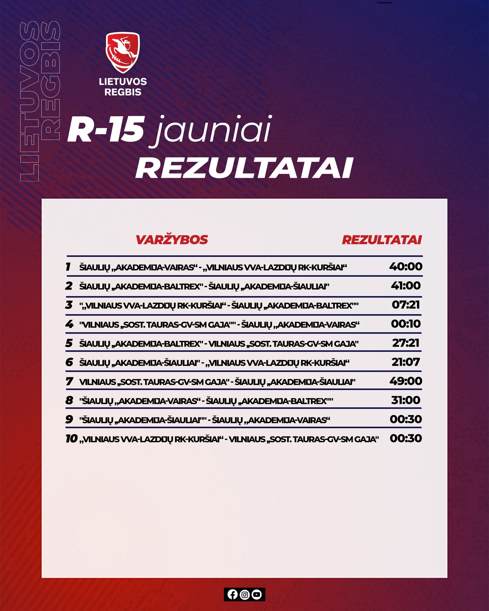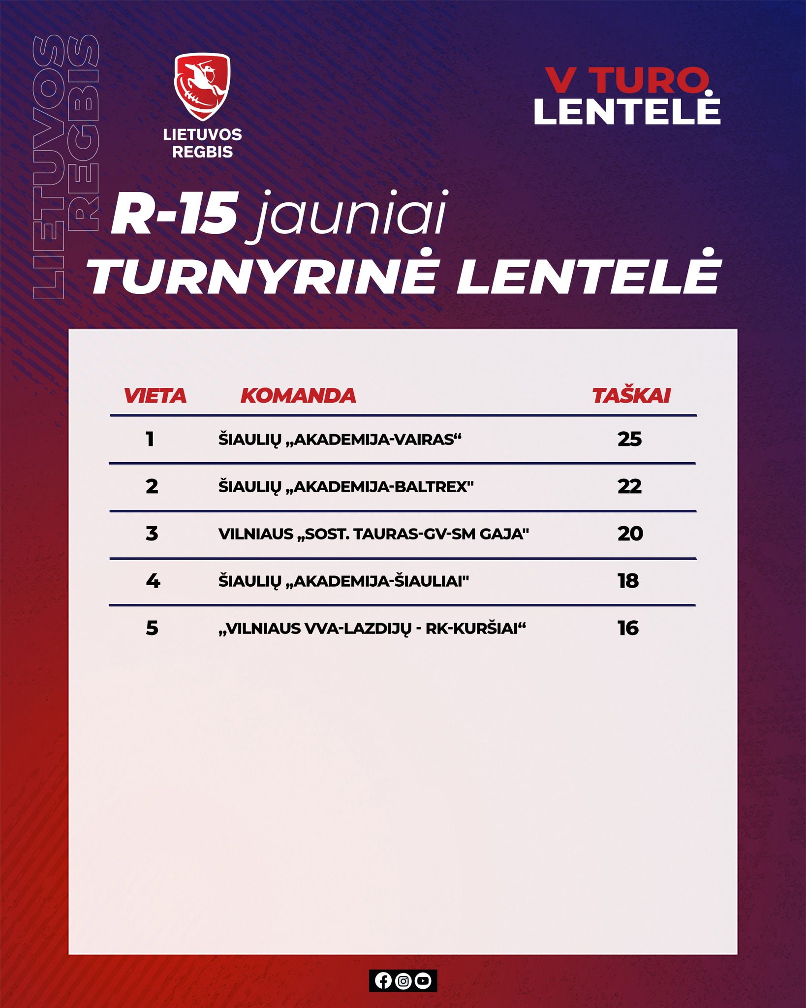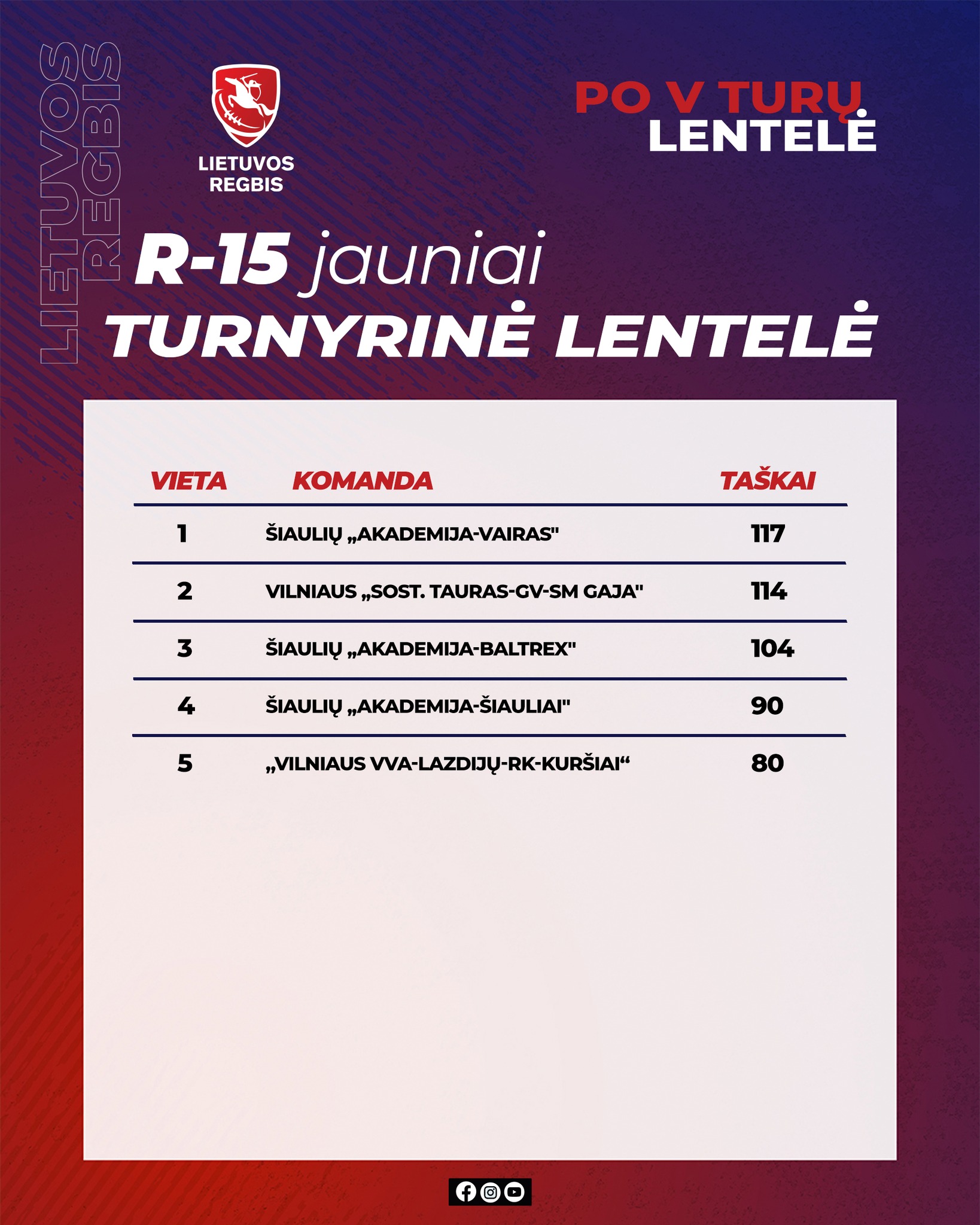 Rugsėjo 6 dieną Šiaulių Gegužių progimnazijos stadione vyko penktasis Lietuvos jaunių regbio-15 čempionato turas, kuriame susirinko penkios komandos iš įvairių Lietuvos miestų. Komandos varžėsi vieno rato sistema – kiekviena sužaidė po ketverias rungtynes.