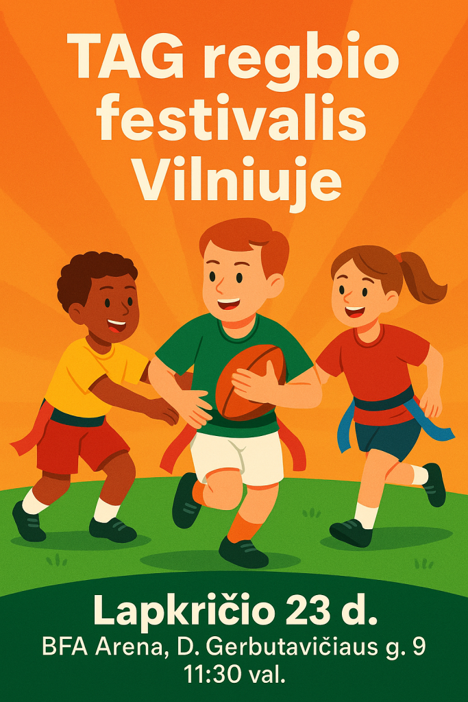 Lapkričio 23 d. Vilniuje vyks vaikų TAG regbio festivalis, kuriame dalyvaus jauniausi sportininkai iš sostinės ir kitų Lietuvos miestų. Šis renginys – puiki galimybė mažiesiems patirti tikrą varžybų dvasią, komandinius iššūkius ir džiaugsmą, kurį suteikia žaidimas drauge. Festivalyje kviečiami dalyvauti vaikai, gimę 2018–2016 m. ir 2015–2014 m. amžiaus grupėse. Dalyvių laukia daugybė rungtynių, prizai ir smagi sportinė atmosfera, kuri įkvepia tobulėti ir stiprina bendrystę tarp komandų.